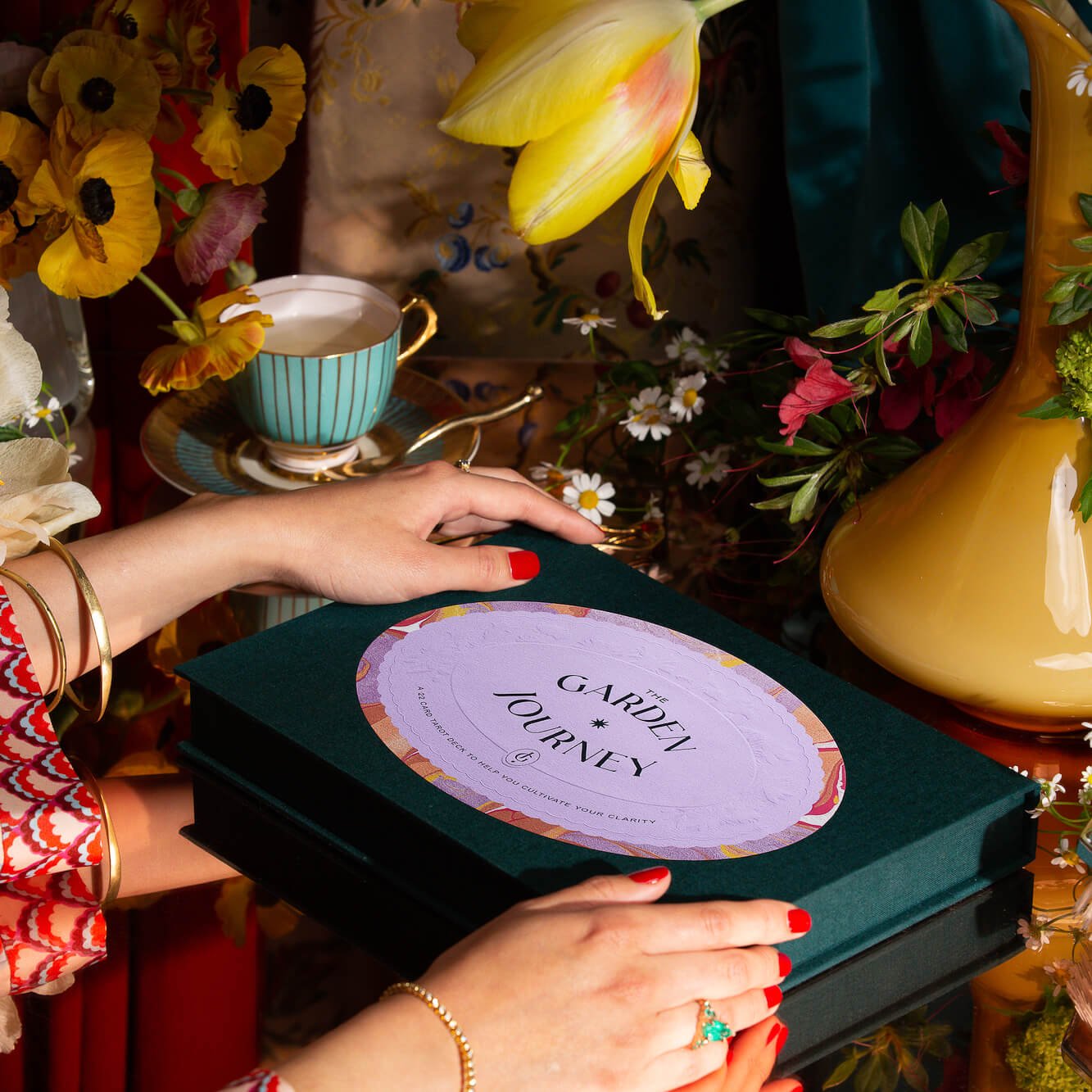 - 22 card Deck printed on luxurious velvet-touch cardstock, featuring rich botanical illustrations and hand-marbled details